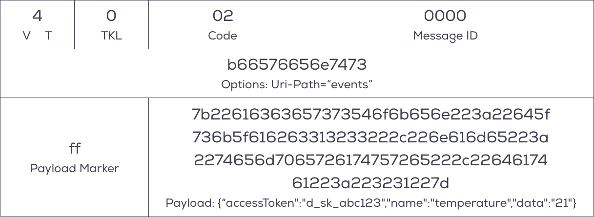 For this, we are going to show the packet structure of a device publishing an Event to Wia. The packet itself, along with the payload, should be transmitted in hex format.