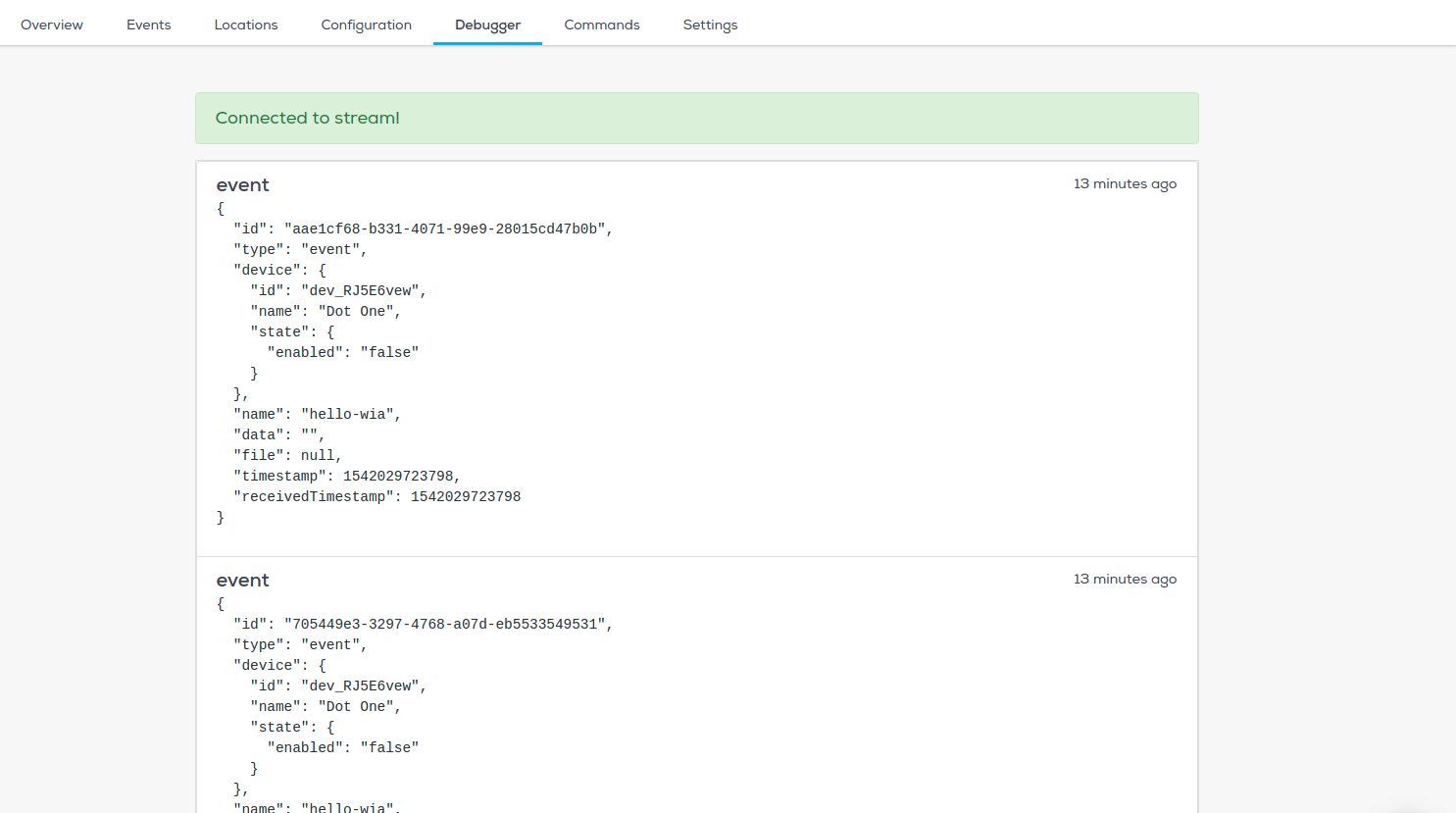 Now go to your device in the Wia dashboard and you should see the data appearing in the debugger.