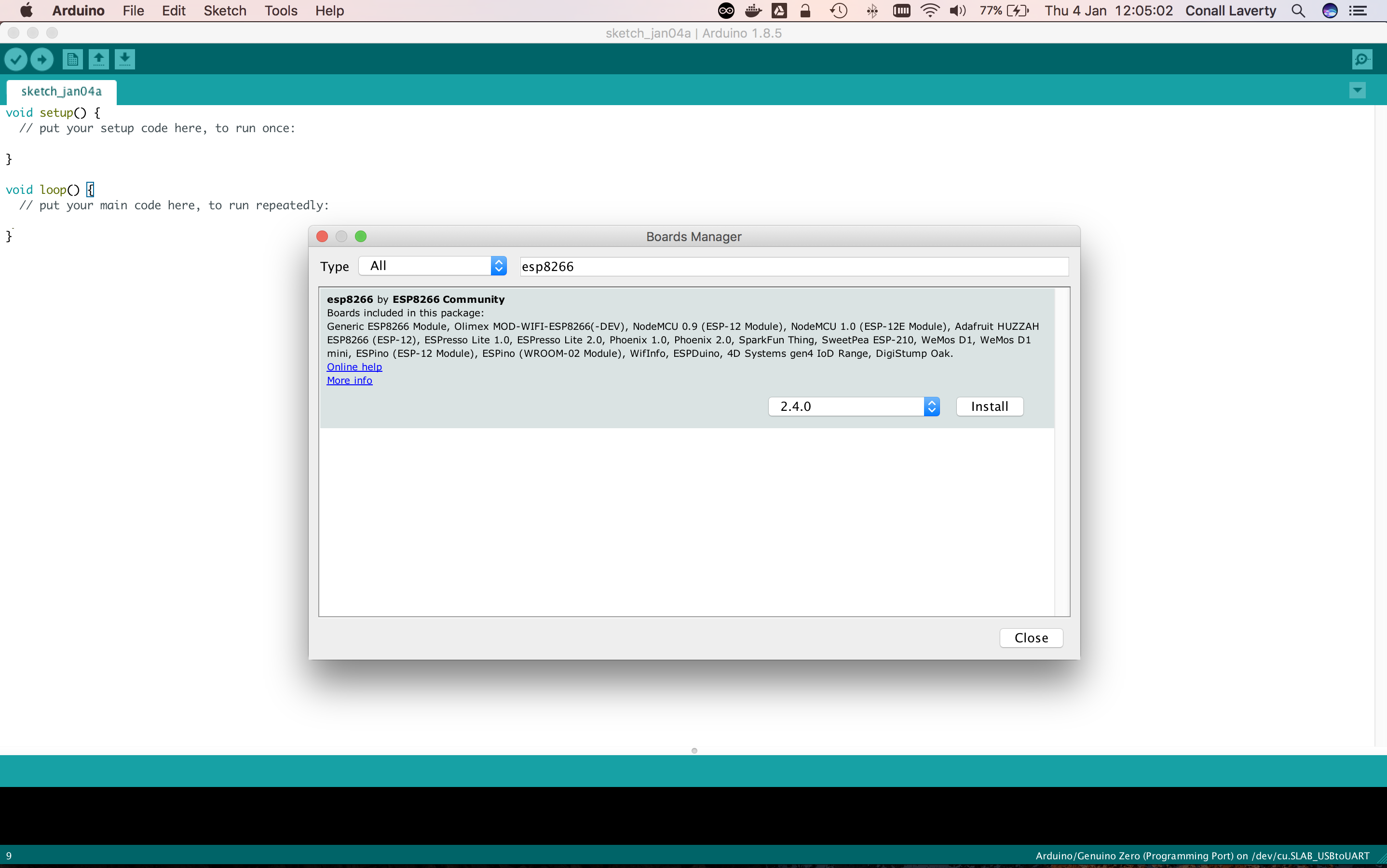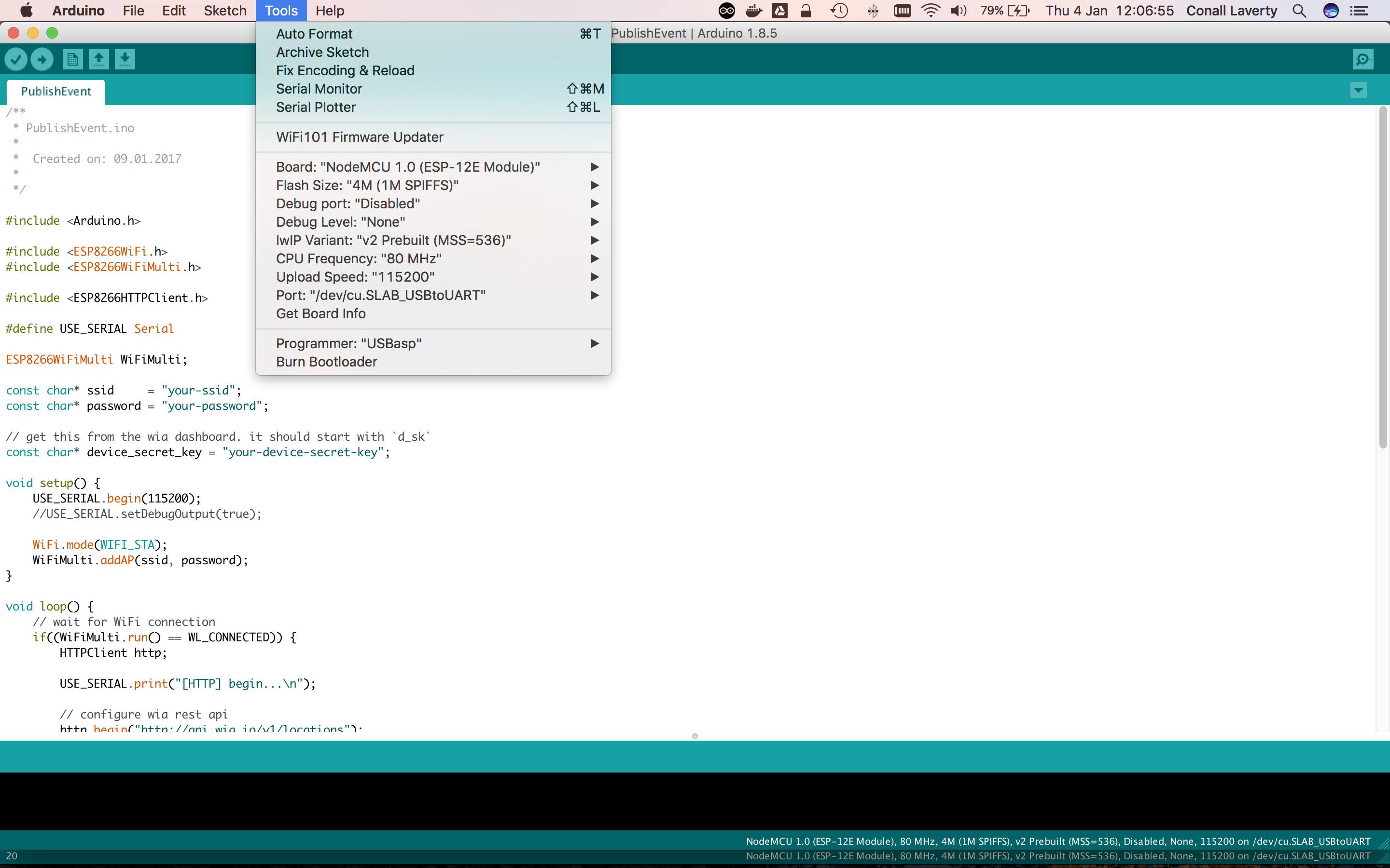 , then choosing your type. For this example, you can useNodeMCU 1.0 (ESP-12E Module)