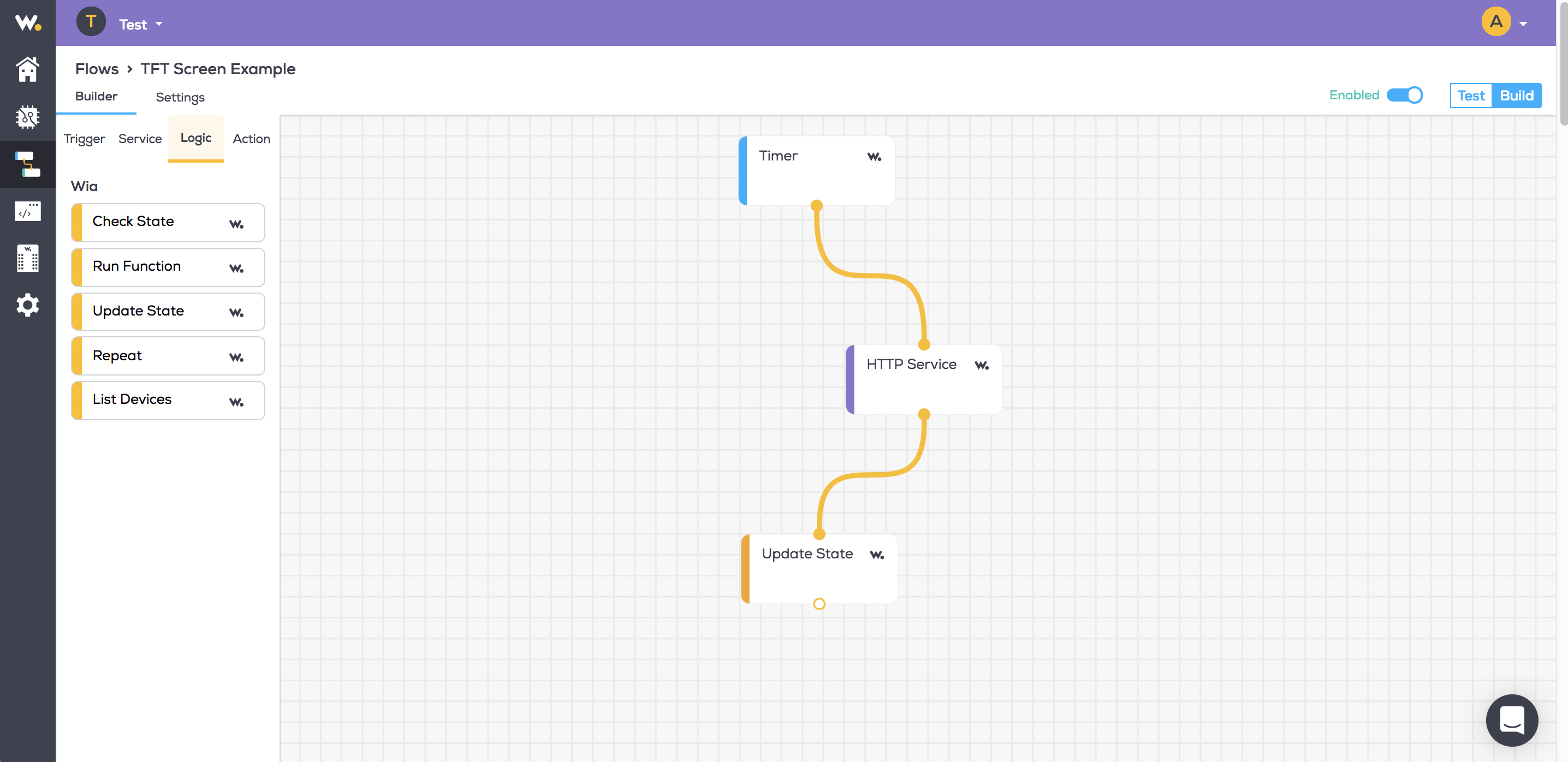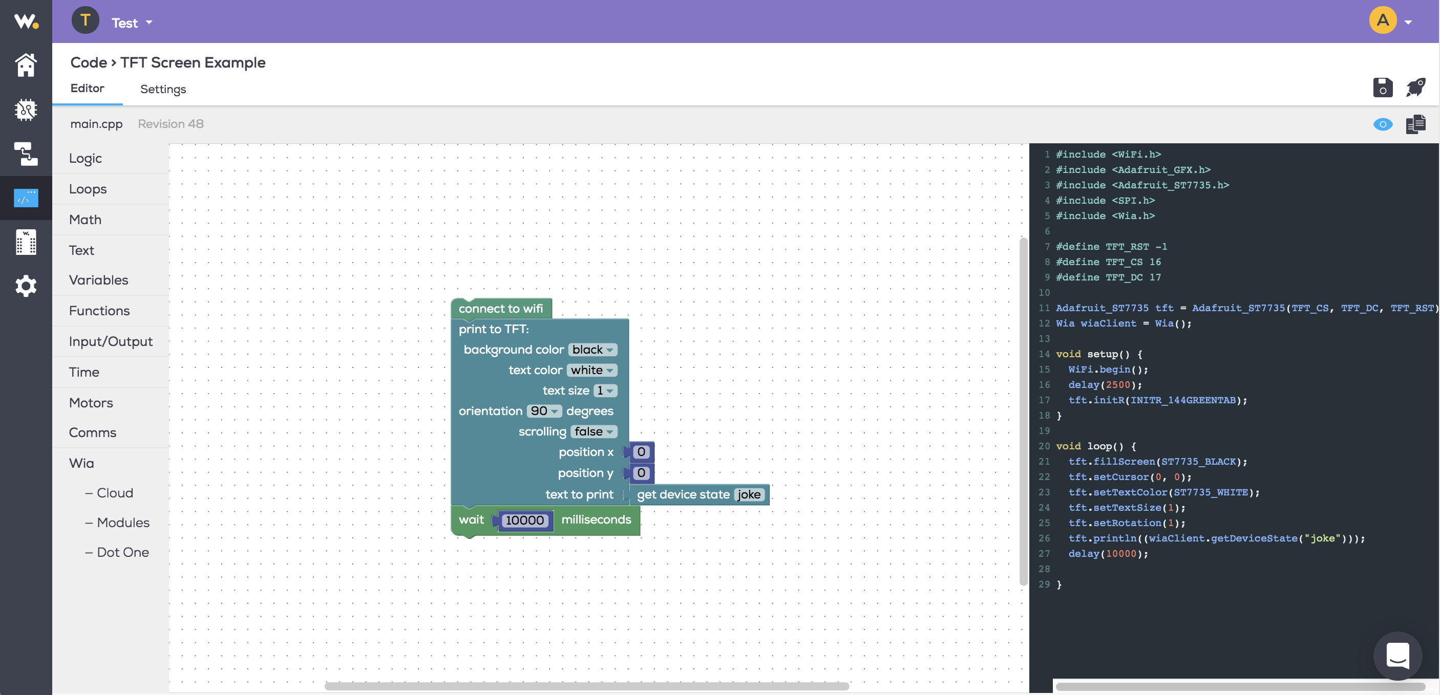 - Open Wia > Modules and drag the block print to TFT onto your diagram. Connect it just below the connect to wifi block. You're almost there!
