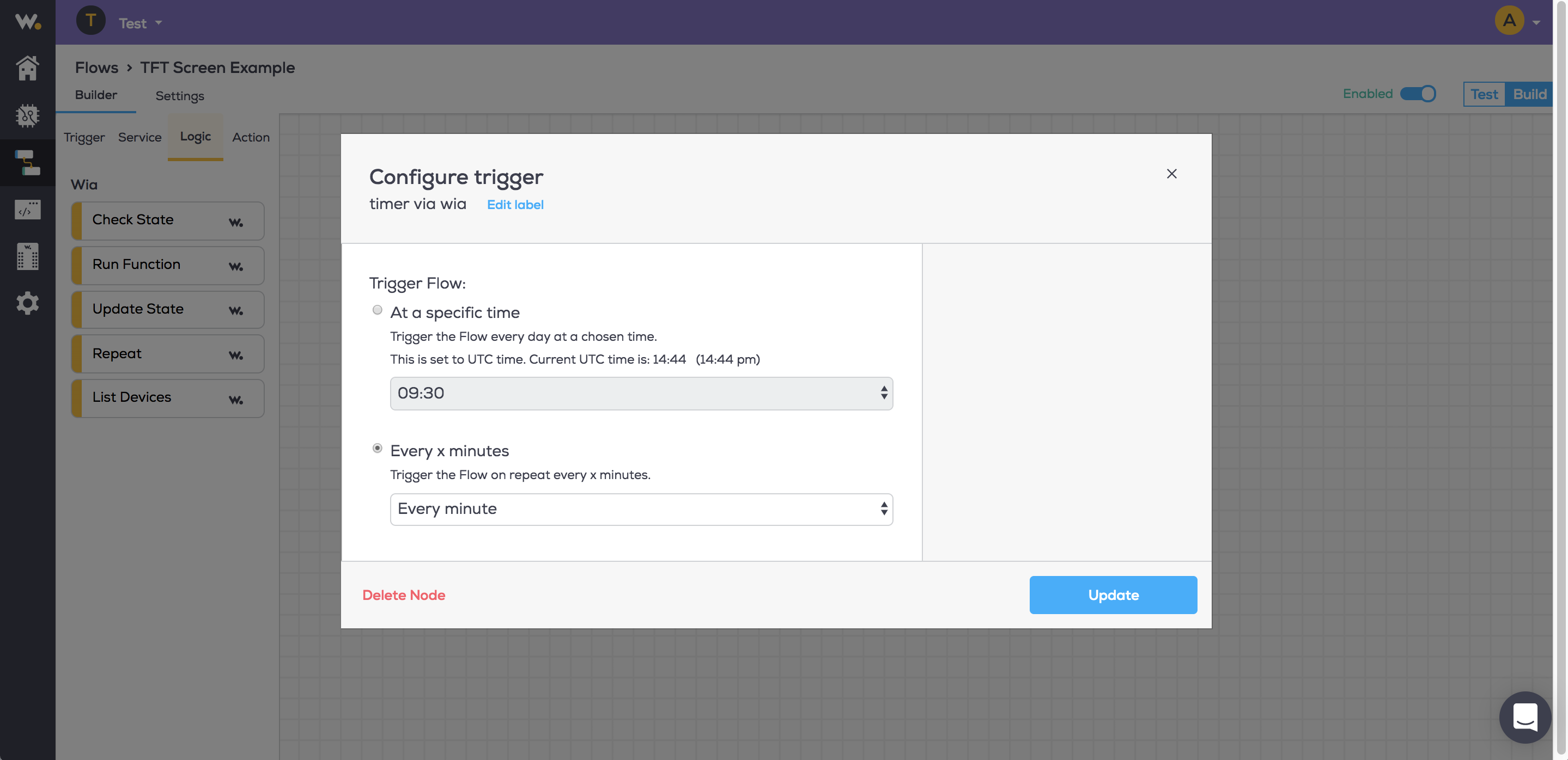 - First go to the Trigger >Wia and drag a Timer node into the workspace
