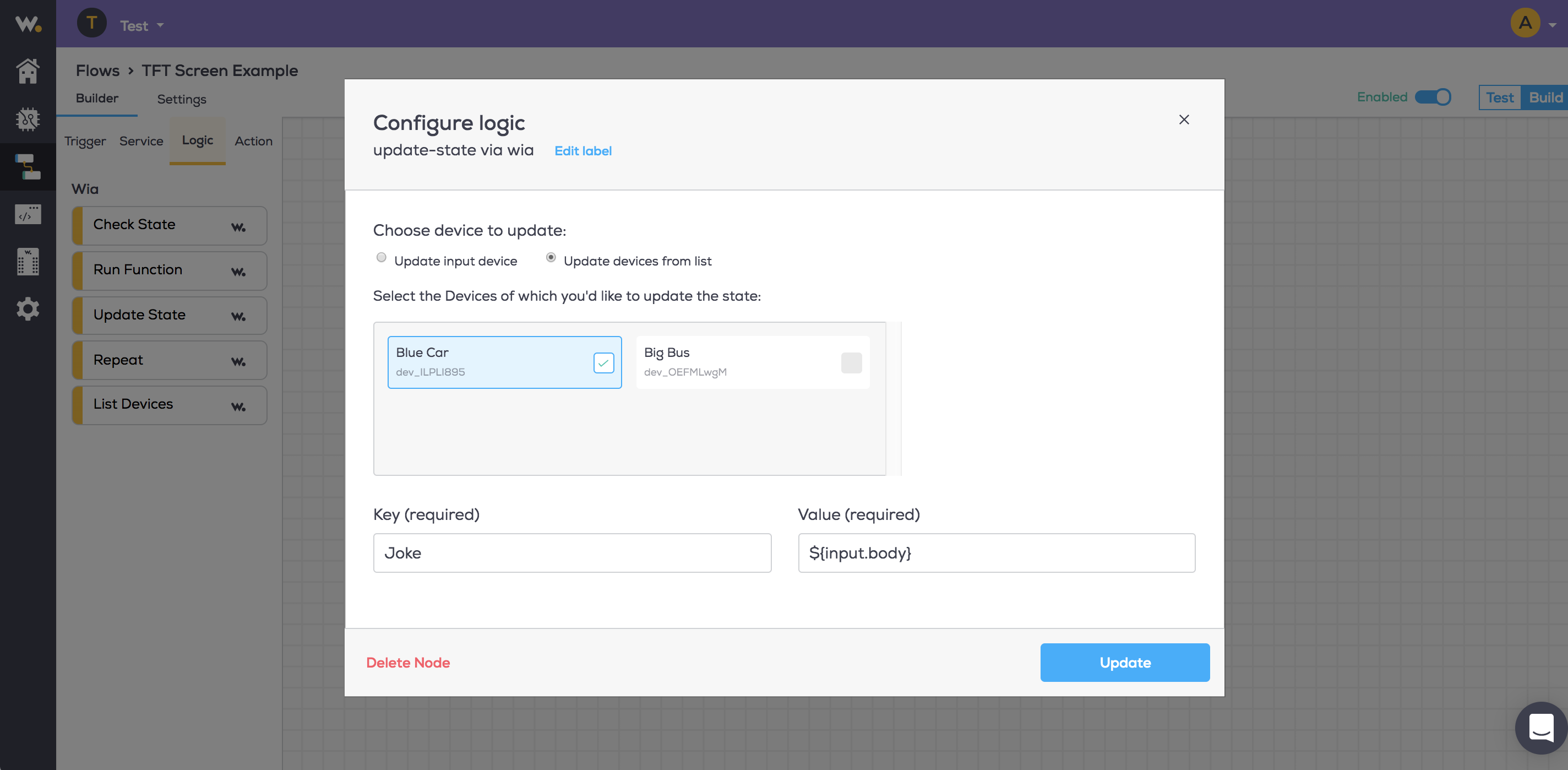 - Now go to Logic > Wia and drag and Update State node into the workspace.